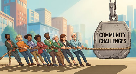 Depicts teamwork overcoming obstacles. Diverse group pulls rope against community challenges. Highlights collaboration in urban environment against difficulties.