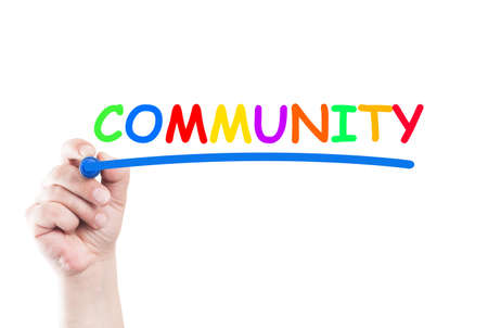 Word community written by hand using a marker and underline on transparent wipe board with white background and copy space