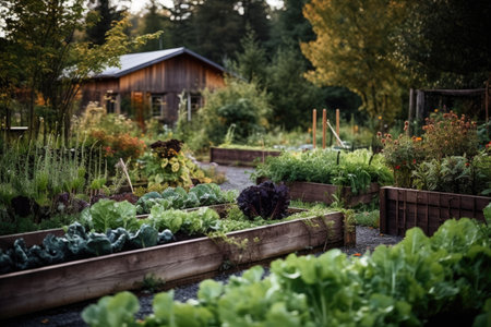 raised beds filled with abundant, diverse vegetables, created with generative ai