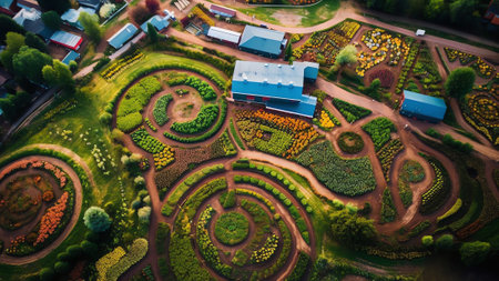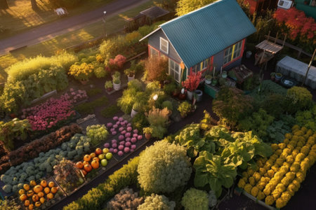 aerial view of a colorful, well-maintained vegetable garden, created with generative ai