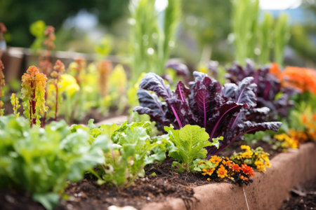 flower bed filled with colorful blooms and vegetables growing nearby, created with generative ai