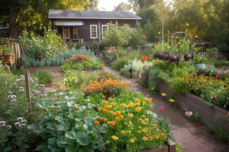 a backyard with a variety of garden beds, each filled with different plants and blooms, created with generative ai