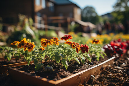 Orange flowers growing in raised garden beds in a community garden, promoting urban farming and sustainable living