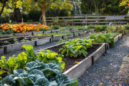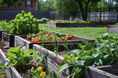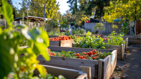 In a vibrant community garden, raised wooden beds are filled with lush greenery and various vegetables like spinach, tomatoes, and herbs, flourishing under the warm summer sun. Generative AI