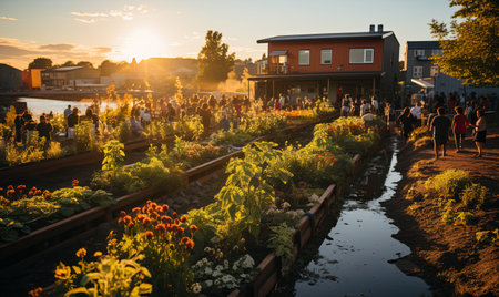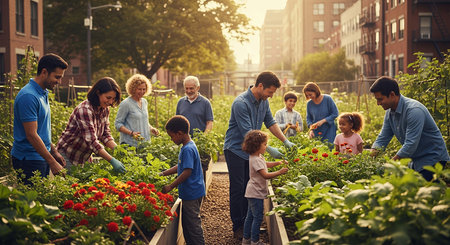 Community members tending to vibrant garden beds in a local urban garden during golden hour in summer