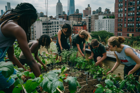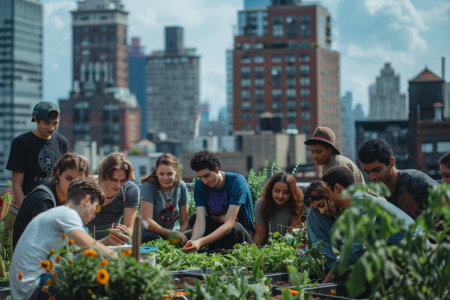 diverse group of young people gardening on a rooftop