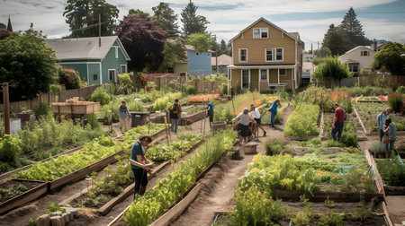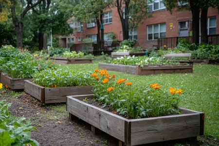 Thriving urban community garden oasis providing sustainable gardening opportunities for local residents, promoting communal activity and healthy living in the city