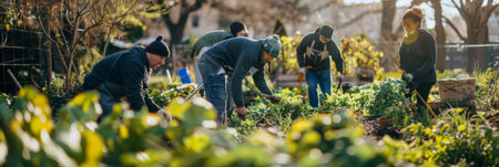 Volunteers work together in a community garden, tending to plants while enjoying the outdoors and collaboration.
