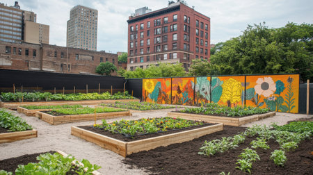 A vibrant urban community garden featuring raised vegetable beds, surrounded by a colorful mural. This green space promotes sustainability and healthy living in the city.