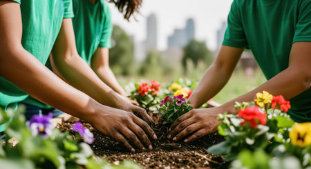 Close up of three individuals in green shirts actively planting vibrant flowers in a community garden, symbolizing teamwork and environmental stewardship for urban greening projects.
