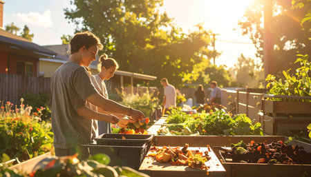 Generative AI, inspiring photo of a diverse group of people working together in a community garden, cultivating organic produce and composting food waste