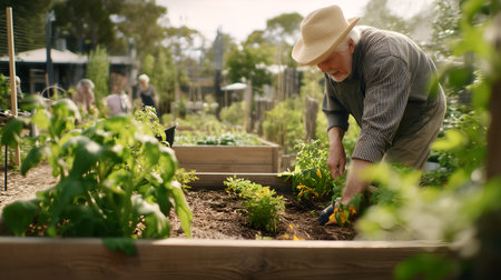 Three older adults tend raised beds in a sunny garden. Tomato plants, gloves, and greenery evoke sustainability, wellness, and peaceful community engagement.