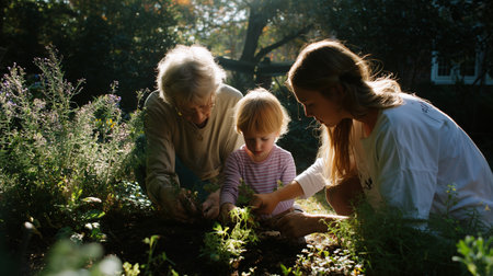 garden young summer nature kids sunlight family planting girls green. Generative AI.
