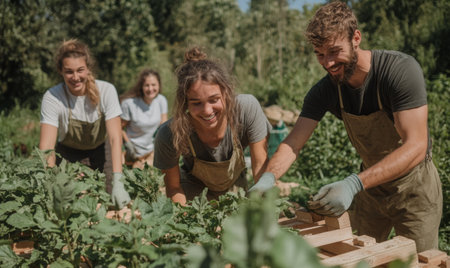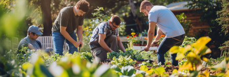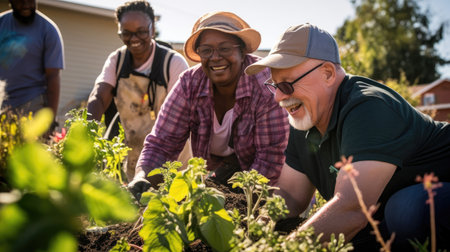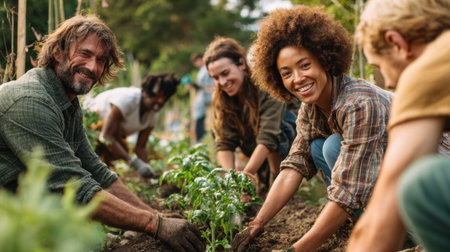 Happy individuals cultivate a lush garden sharing smiles and teamwork in the warm sun.