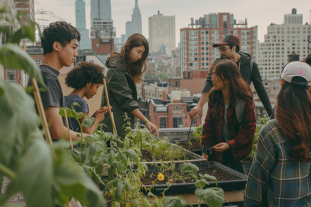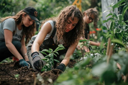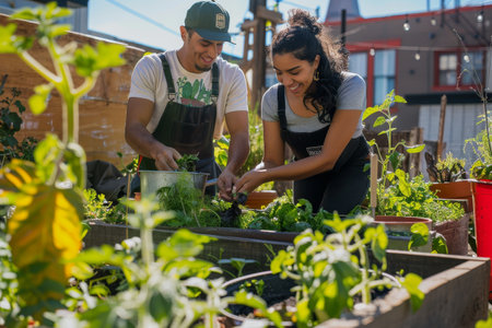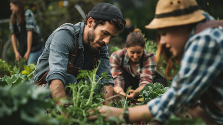 Volunteers work together in a community garden, tending to plants while enjoying the outdoors and collaboration.