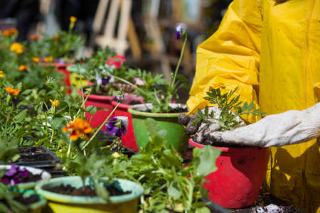 Hands of a horticulturist with protective gloves transplanting a flowering plant in a garden