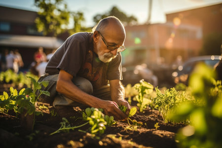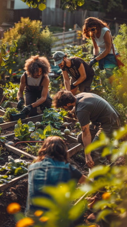 Community members tending to vibrant garden beds in a local urban garden during golden hour in summer