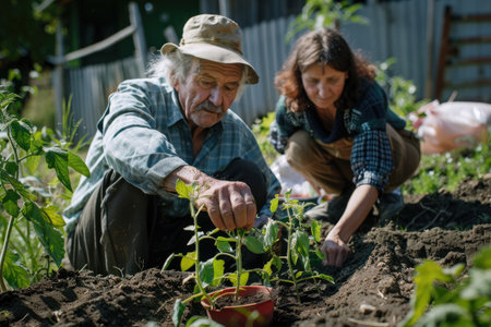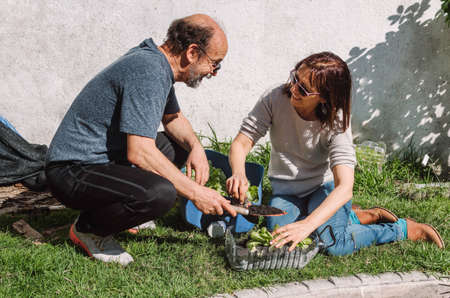 Stock photo of old man and adult woman cultivating plants in the garden during sunny day. Gardening concept.