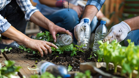 This image captures individuals engaging in eco-friendly gardening by planting colorful flowers in recycled plastic bottles, showcasing community involvement and sustainability efforts.