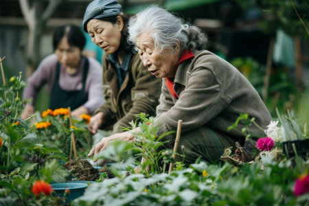 A group of asian elderly are gardening in a nursing home bokeh style background