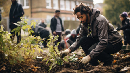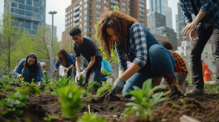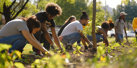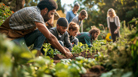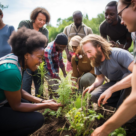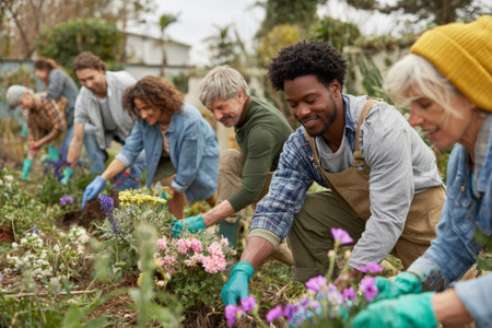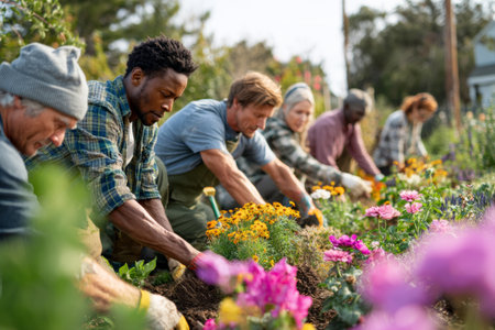 Group of diverse individuals work together in a community garden, planting flowers and fostering environmental awareness during a warm afternoon, enjoying cooperative gardening practices.