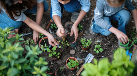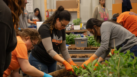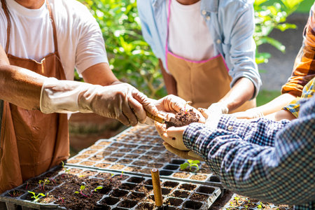 Gardeners fertilizing and transplanting young sprouts into pots at a vibrant community garden, nurturing growth and promoting healthy lifestyles