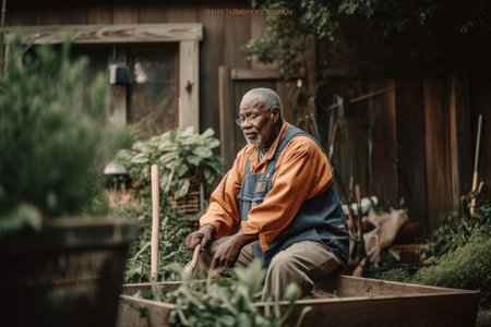 Male African elderly gardening in backyard plants grass. Generative AI AIG23.