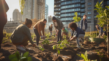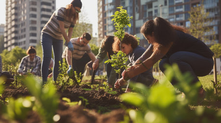 Multicultural group plants trees in urban garden, symbolizing teamwork, climate action, and collective reforestation efforts.