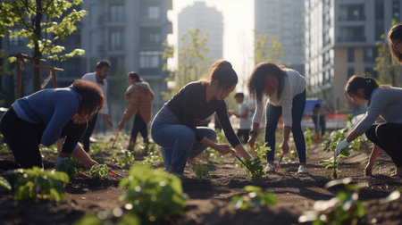 Neighbors come together for a community gardening event, planting vegetables in a vibrant neighborhood garden on a sunny day