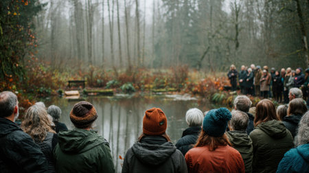 People gather for a family memorial service by a body of water in nature, sharing quiet moments in unity while surrounded by trees.