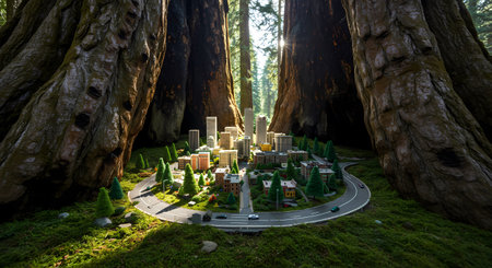 This image depicts an eco-conscious community engaged in various outdoor activities within a lush forest environment. The scene showcases sustainable practices, with people interacting near a stream and in wooded areas. The composition features vibrant colors, natural lighting, and a focus on environmental awareness, suitable for editorial and commercial applications.