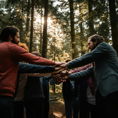 A group of business professionals trekking through lush forest trails, bonding over team-building exercises amidst breathtaking natural scenery.