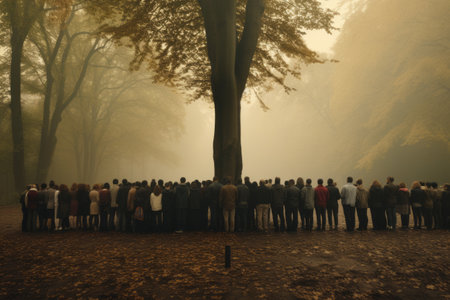 A diverse group of individuals connect with nature by placing their hands on the textured bark of a massive, old tree surrounded by a foggy woodland environment