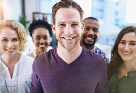 Were definitely a passionate team of creatives. Portrait of a team of designers standing together in the office.