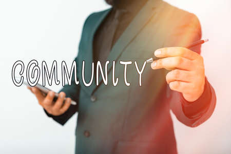 Handwriting text writing Community. Conceptual photo group of showing living in one place having a characteristic in common Model displaying different shots of holding pen ready for promotional use