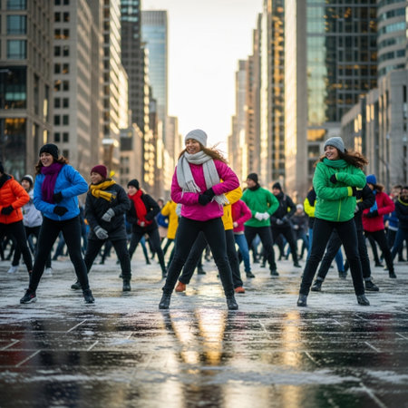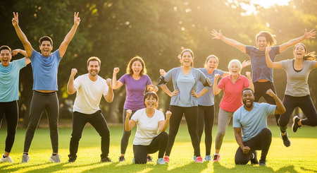 Friends are engaged in a fitness session outdoors, enjoying the warm sunlight while sharing smiles and laughter, creating a vibrant atmosphere of camaraderie.