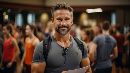 Smiling student stretches after intense training, surrounded by colleagues and gym equipment., generative AI