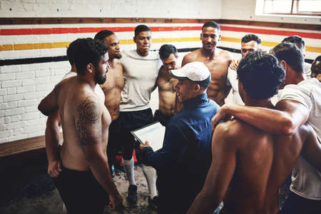 Ive the plan considering our next game. Cropped shot of a rugby coach addressing his team players in a locker room during the day.