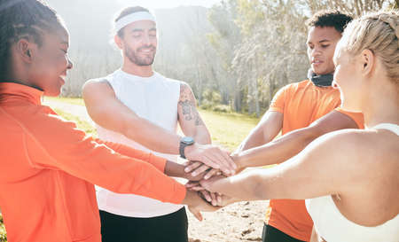 We keep each other motivated. a diverse group of friends standing together with their hands piled in the middle during their outdoor workout.