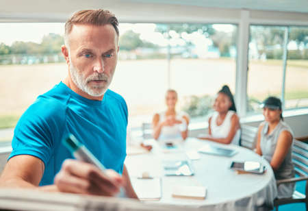 This is the spot where youll win against your opponent. a handsome mature coach standing and writing a game plan while his tennis team listen.