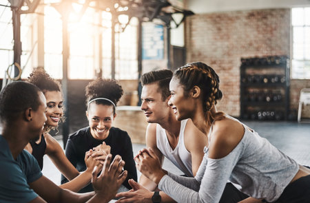 Diverse group of fit healthy friends talking chatting laughing in gym waiting for workout class