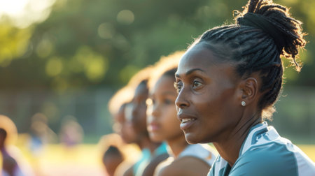 A young Black female athlete with braided hair in a bun is looking intently to the right, watching a game on a sunny day. She is sitting in a row with her teammates, all in athletic attire.