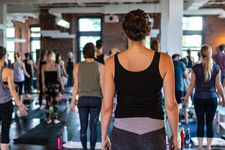Diverse group of people in yoga class. View from behind a healthy woman with brunette hair tied in a bun and wearing a black cropped top during a gym workout, standing in a relaxed breathing posture