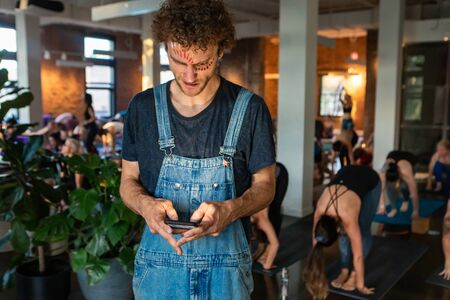Diverse group of people in yoga class. An irritated young Caucasian man wearing denim dungarees at the front of a yogic session, standing and using smartphone as people stretch on exercise mats.