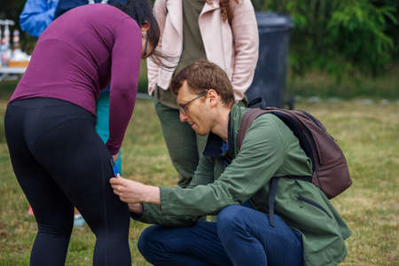 Young people and consultants with clipboard during an outdoor game in team building workshop