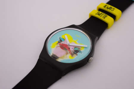 Geneve, Switzerland 07.10.2020 - Swatch childrens swiss made plastic watch, ostrich head on dial. youth hipster style watch for bright image. Swatch Group watch production