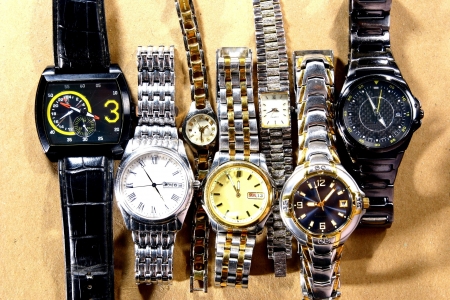 Inexpensive unbranded wrist watches kept on table for sale in a Inidan market. Street side shop. full frame. background themes.