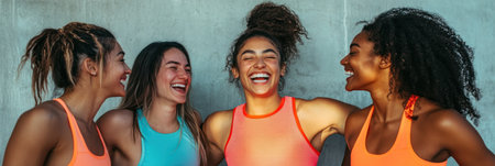 Joyful friendship and laughter among diverse women in colorful athletic wear against wall
