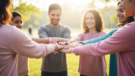 Diverse group stacking hands with pink ribbons in park