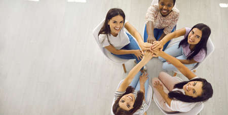 Banner with overhead group portrait of happy positive smiley beautiful young women sitting together, holding hands and looking up. Unity, community helping each other, team aiming for one goal concept